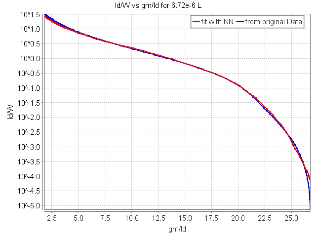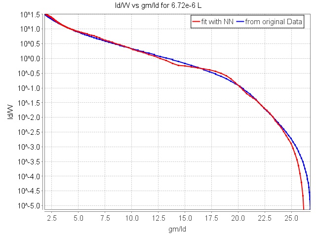The data is then plotted for id/w vs gm/id from both the simulated data and the model output