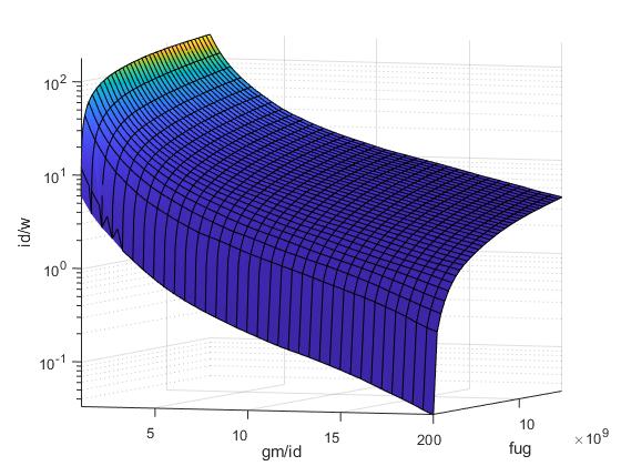 Using the model matlab is also able to intuitively plot the output characteristics of the model in higher dimensions. This plot shows the corresponding id/w for any gm/id and fug given. The resulting curve covers far more points than the input simulation did. Due to the number of points that need to be calculated, creating this figure can take a few minutes. As such the code to create it is stored in the JavaInMatlab.m script where it can be ran.