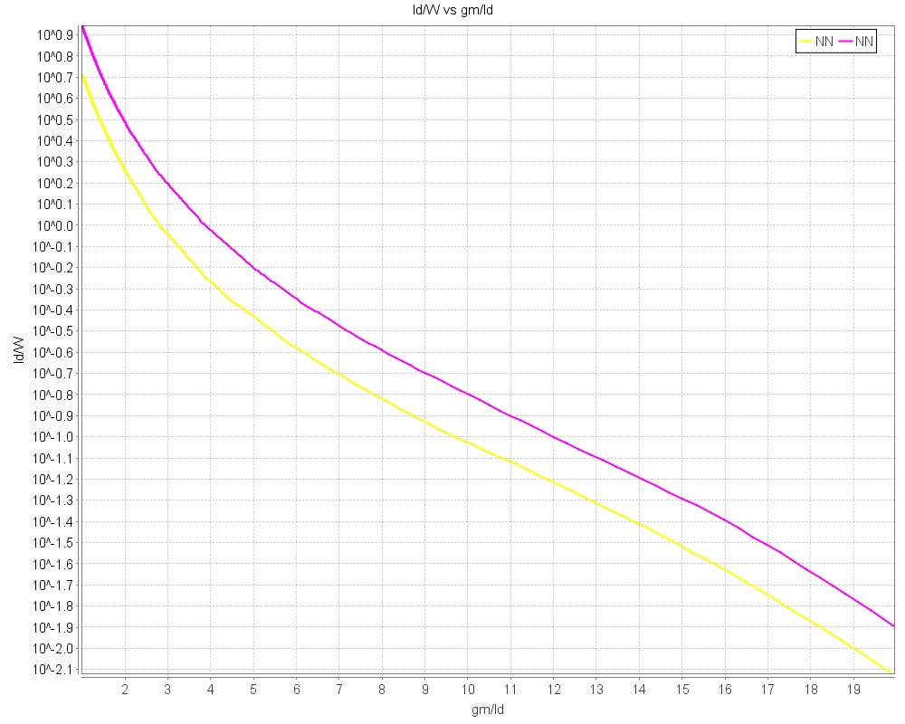 Two lengths are sampled from the input dataset housing ~100 lengths and the gm/id vs id/w curves are plotted correspondingly. With tuned parameters the curves can be nearly identical as shown below